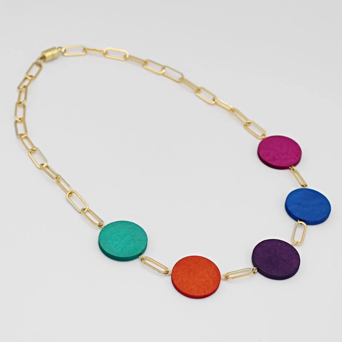 A new design that symbolizes the delicate balance between nature's authenticity and contemporary artistry. This necklace features a gold plated link chain strung together accented an array of vibrant wood beads and finished with a magnetic closure. You can easily wear this necklace alone or with coordinating earrings.